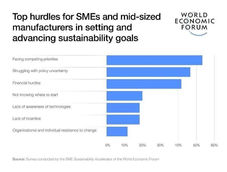 A 23 June 2025 World Economic Forum white paper, Sustainability Meets Growth: A Roadmap for SMEs and Mid-Sized Manufacturers, makes a useful point: small and mid-sized manufacturers can be powerful multipliers of climate action, particularly in decarbonizing value chains because they sit inside global supply networks. The report also indicates that fast-tracking sustainability transitions by SMEs can materially improve progress toward Paris Agreement goals while unlocking economic growth.