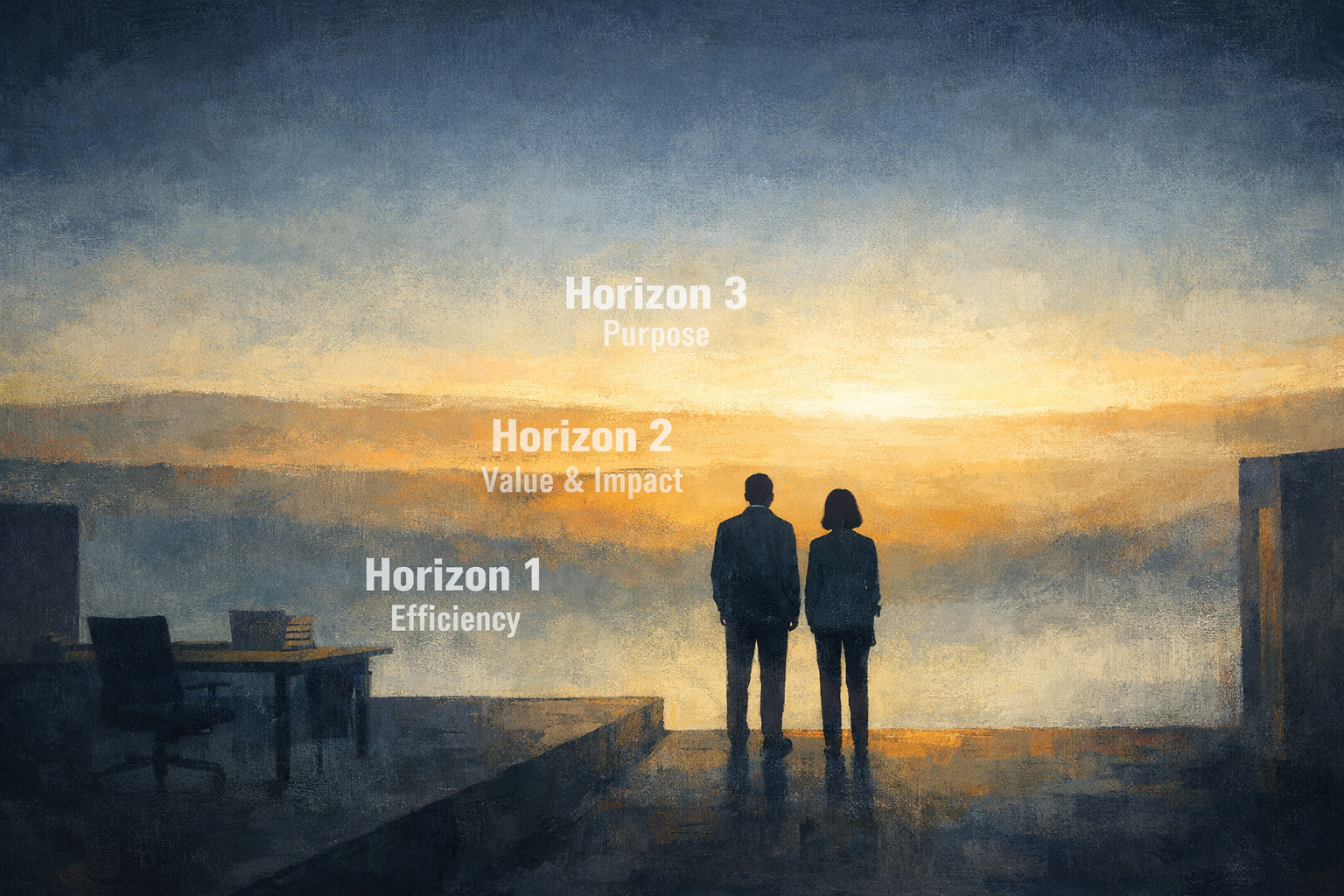 Horizon three: naming the long-term purpose question out loud, even when the answer is not yet clear, because the cost of not asking it is higher than the discomfort of sitting with uncertainty.